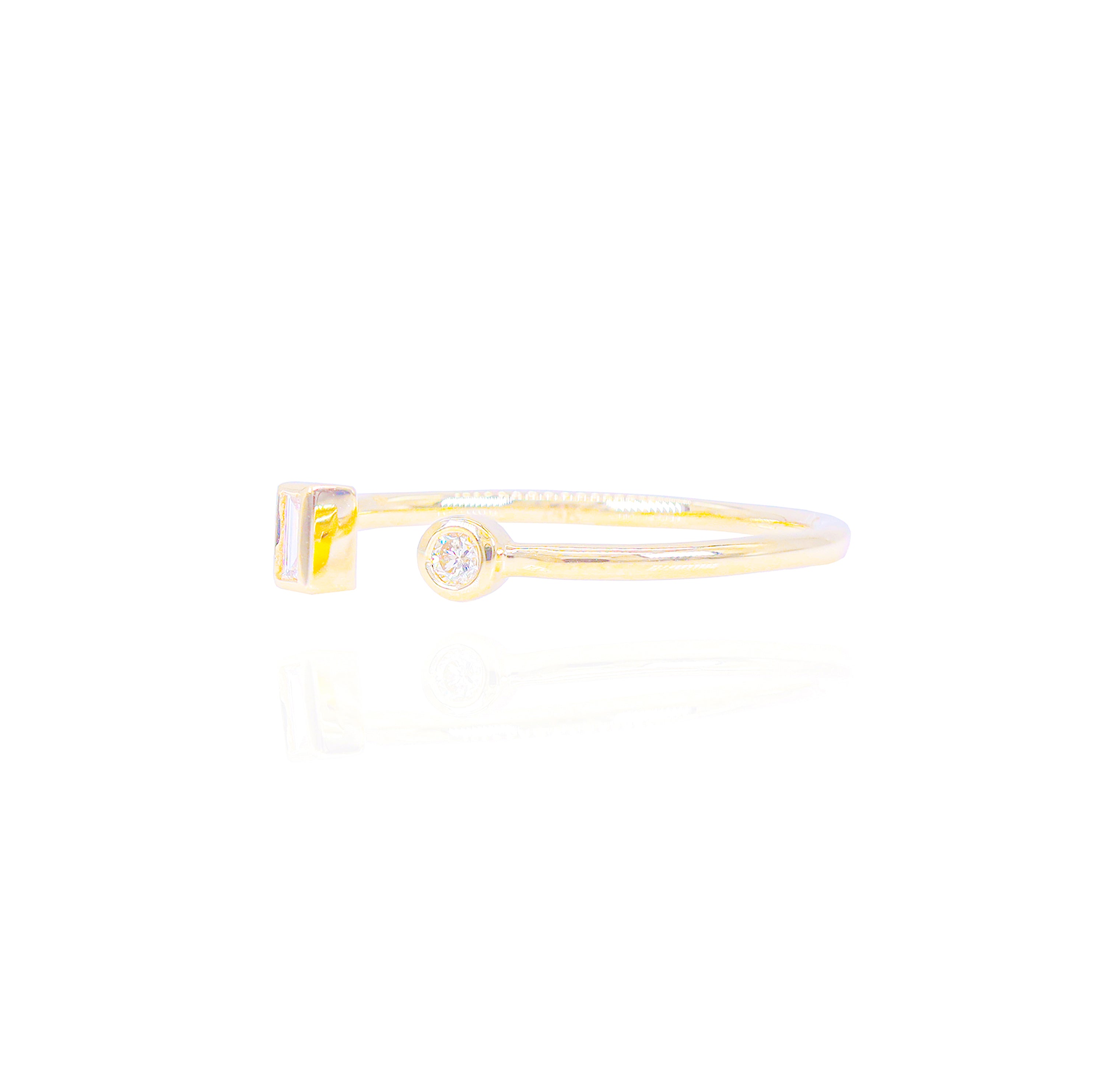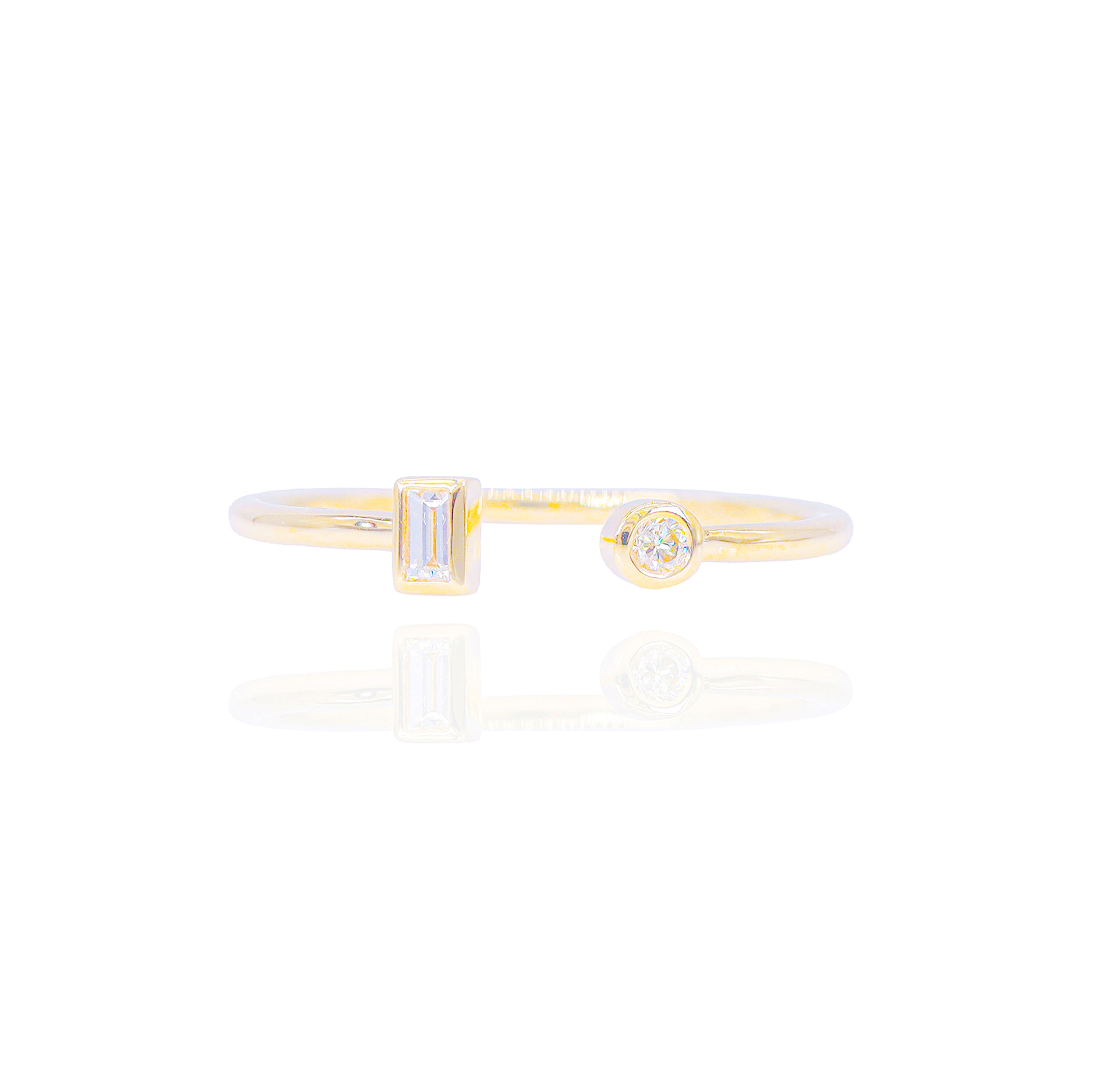 This elegant Emerald & Round Singular Diamond Ring is crafted from solid 14kt yellow gold, offered in your choice of white, yellow or rose. Featuring a dramatic emerald cut VVS-VS quality diamond and a round diamond, it's the perfect piece for a timeless look.